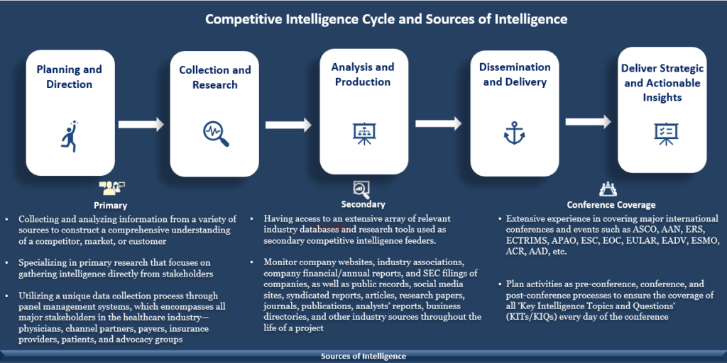 eQuantX provides exceptional quality competitive intelligence services to pharma with the help of our integrated CI platform which comprises a team of therapy area specialists, researchers, market modelers, and technical developers. Our competitive intelligence cycle starts from the planning with the help of designing hybrid methodology using primary, secondary and conference intelligence.